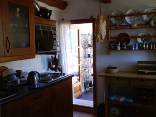 Här finns spis med fyra kokplattor, micro, kylskåp med frysfack, samt porslin för en hel familj. En dörr leder ut till balkongen. Balkongen är inte så stor, men sval och skön på eftermiddag och kväll. Ta av mat & dryck, och kompletteringshandla innan du åker.